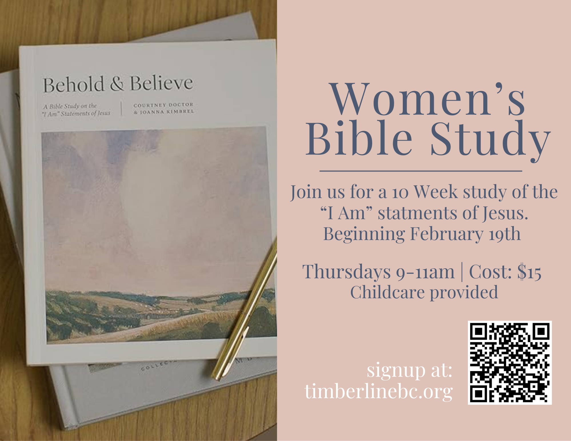 Ladies, join us for a 10-week Bible study starting February 19th! Whether you’ve never read the Bible, have followed Jesus for many years, or find yourself somewhere in between, this Bible study from Courtney Doctor and Joanna Kimbrel will help you behold and believe who Jesus truly is using the “I Am” statements in the Gospel of John. Cost is $15. Childcare is available. Click HERE to register.